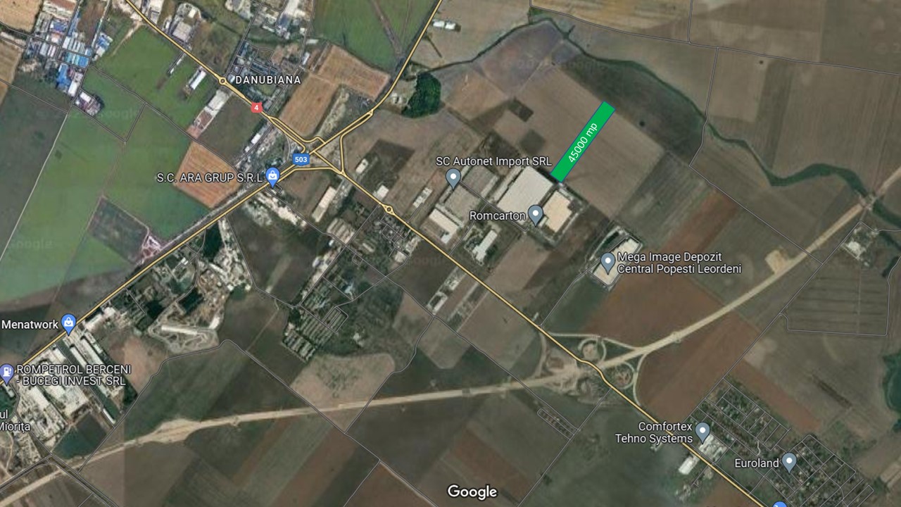 Popesti Leordeni, teren extravilan, situat intre cele 2 centuri ale Bucurestiului, in spatele depozitelor JUMBO, ROMCARTON si MEGA IMAGE, suprafata totala 45,000 mp, deschidere 78 ml, utilitati la 50 m de teren, pretabil pentru hale industriale si logistica, pret 24 euro/mp.
